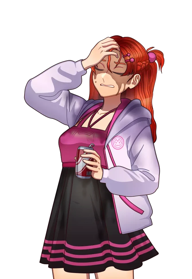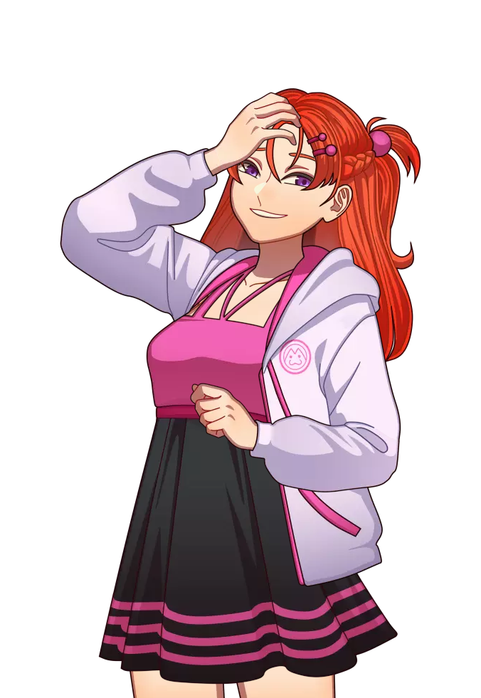 She wears a pale purple hoodie with pink accents and a loose fit, open to reveal a pink top underneath. The jacket also has a cat-like emblem on the left side of her chest. Whenever Maya puts on her hood, cat-like ears stand out (in game can only be seen in the gymnasium). The pink top beneath the jacket is a slightly deeper shade than the accents, with a low but modest neckline.