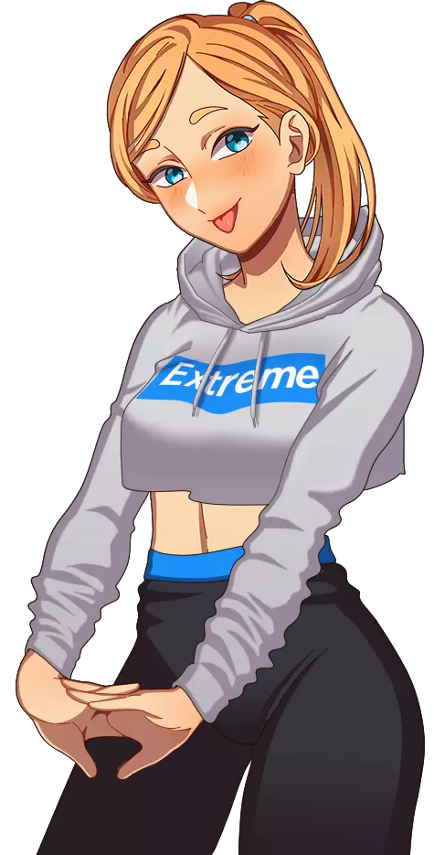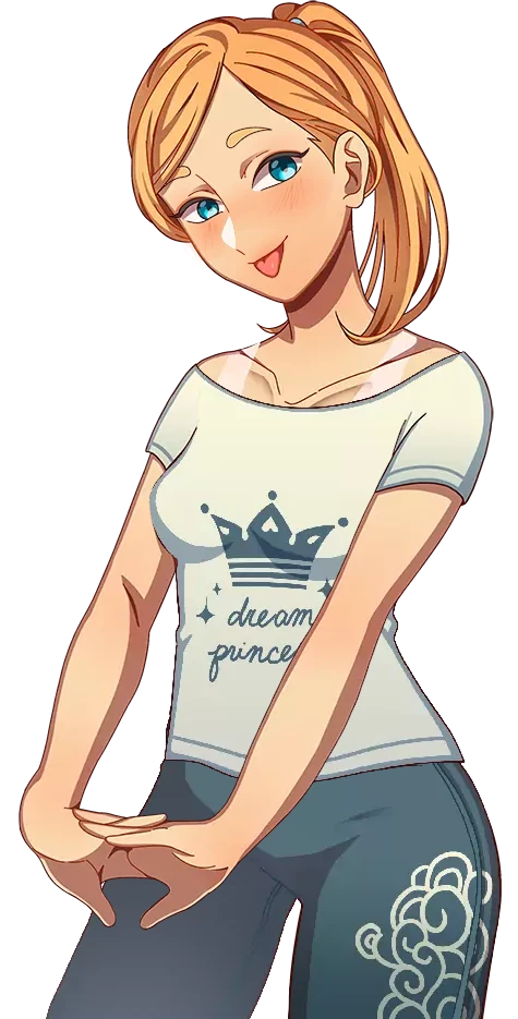 She has two alternate casual outfits. The first consists of a gray cropped sweatshirt with the logo for the fictional brand "Extreme" printed on it in blue, complete with black sweat pants, pale blue socks, and black running shoes. The second consists of a light gray T-shirt decorated with a blue crown and the words "dream princess" written in cursive, complete with blue sweat pants with a white cloud-like design on the side.