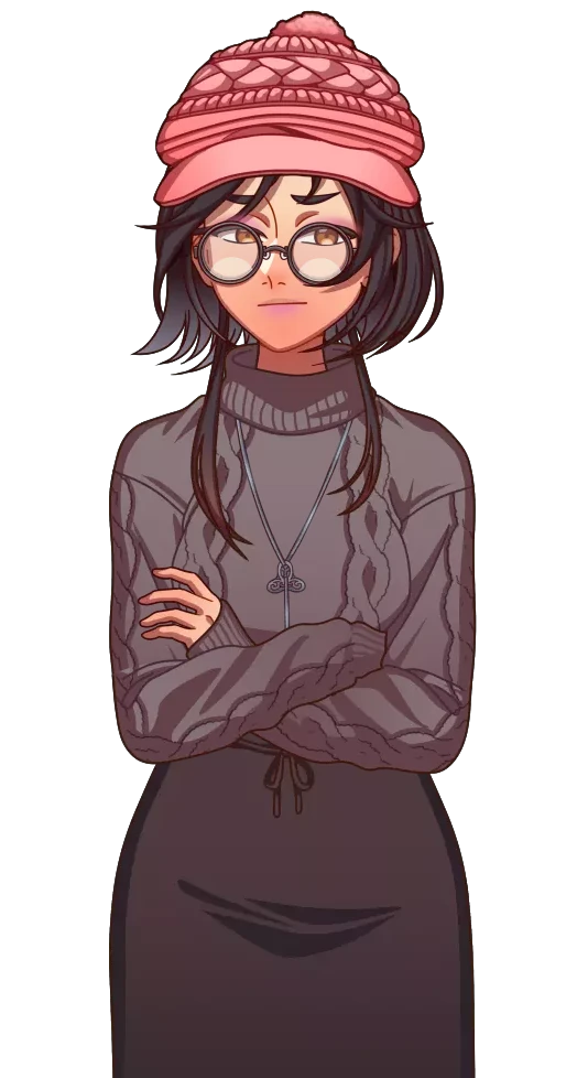 Maxine wears a pink knitted hat on top of her short black hair, a few long strands of which reach down past her shoulders. Her amber eyes lie partially hidden behind a pair of round-lens glasses, and she dons pink eyeshadow and lipstick. While it may not be immediately obvious based on her attire, she has a very feminine figure, complete with a full hourglass shape.